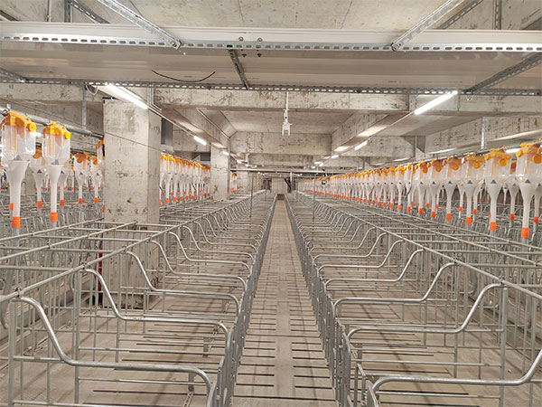 母豬一年要進行2.4輪的生產,每輪定位飼喂分在“配種定位欄”的約120天和在產床的約31天,目前的規模豬場基本上都是用自動供料線自動飼喂,飼養員只在定位欄和產床之間來回趕豬,以減少趕豬次數因而降低了工人的勞動強度。